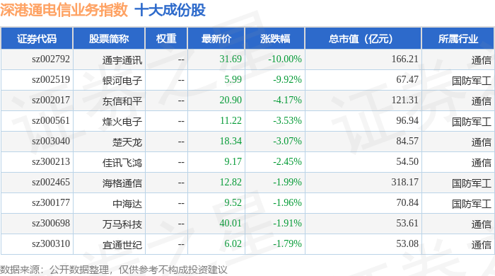 证券之星消息,12月17日,深港通电信业务(983029)指数报收于10563.52点,涨3.55%,成交1152.65亿元,换手率1.73%。当日该指数成份股中,上涨的有47家,长飞光纤光缆以21.21%的涨幅领涨,下跌的有27家,通宇通讯以10.0%的跌幅领跌。