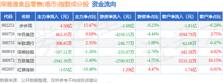 资金流向方面,深港通食品零售(港币)(983038)指数成份股当日主力资金净流入合计1.26亿元,游资资金净流出合计2.12亿元,散户资金净流入合计8637.15万元。成份股资金流向详情见下表: