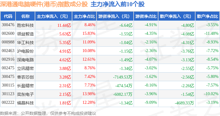 资金流向方面,深港通电脑硬件(港币)(983044)指数成份股当日主力资金净流入合计35.66亿元,游资资金净流出合计22.69亿元,散户资金净流出合计12.97亿元。成份股资金流向详情见下表: