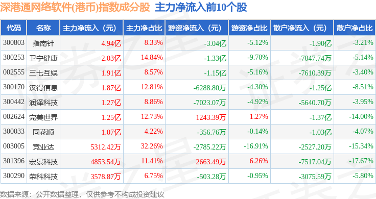 资金流向方面,深港通网络软件(港币)(983048)指数成份股当日主力资金净流入合计1997.72万元,游资资金净流出合计8.47亿元,散户资金净流入合计8.27亿元。成份股资金流向详情见下表: