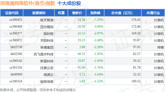 深港通网络软件(港币)(983048)指数十大成份股详情如下:
