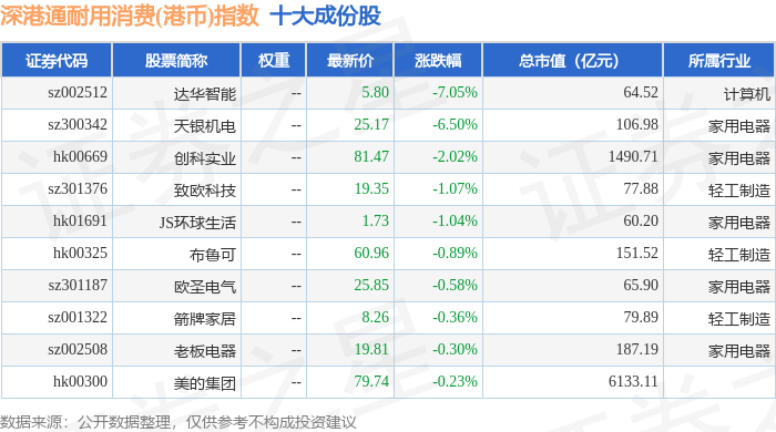 深港通耐用消费(港币)(983050)指数十大成份股详情如下: