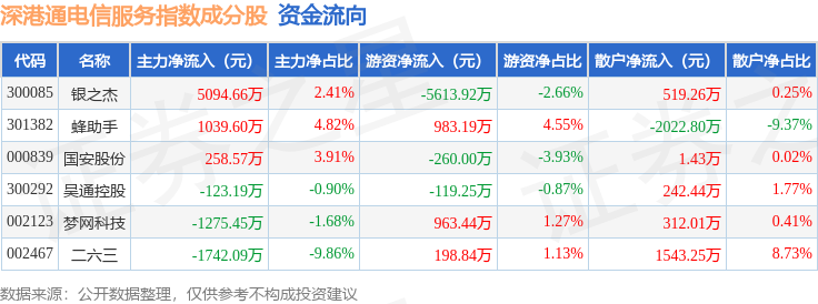 资金流向方面,深港通电信服务(983057)指数成份股当日主力资金净流入合计3252.1万元,游资资金净流出合计3847.7万元,散户资金净流入合计595.6万元。成份股资金流向详情见下表:
