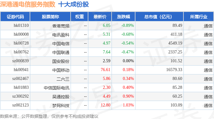 证券之星消息,12月17日,深港通电信服务(983057)指数报收于5838.29点,涨0.27%,成交53.69亿元,换手率0.37%。当日该指数成份股中,上涨的有7家,蜂助手以2.43%的涨幅领涨,下跌的有4家,香港宽频以0.89%的跌幅领跌。