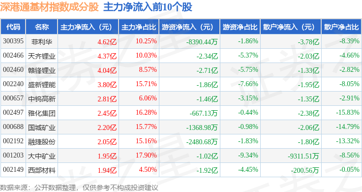资金流向方面,深港通基材(983061)指数成份股当日主力资金净流入合计21.71亿元,游资资金净流出合计19.73亿元,散户资金净流出合计1.98亿元。成份股资金流向详情见下表: