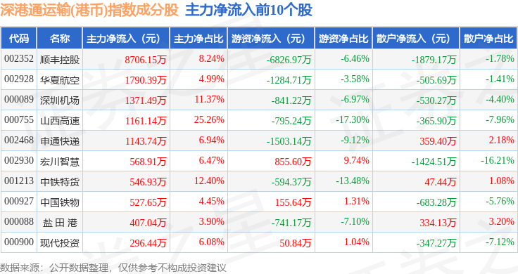 资金流向方面,深港通运输(港币)(983078)指数成份股当日主力资金净流出合计2.32亿元,游资资金净流出合计9117.91万元,散户资金净流入合计3.23亿元。成份股资金流向详情见下表: