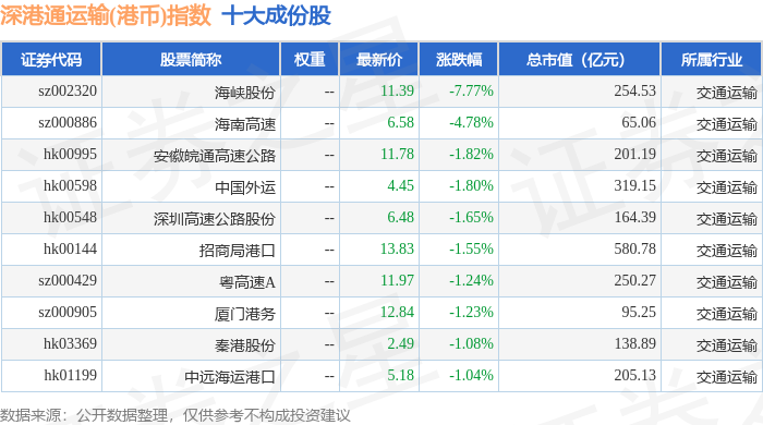 深港通运输(港币)(983078)指数十大成份股详情如下: