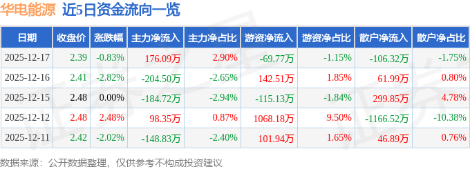 证券之星消息,截至2025年12月17日收盘,华电能源(600726)报收于2.39元,下跌0.83%,换手率0.93%,成交量25.52万手,成交额6069.34万元。
