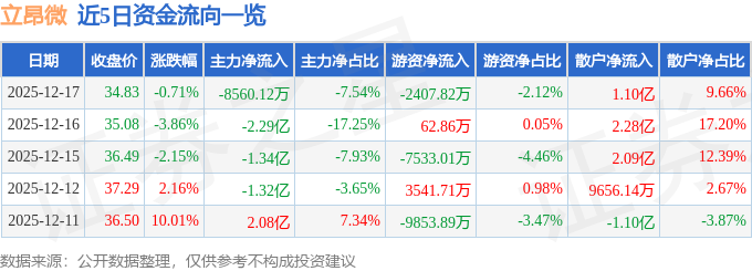 证券之星消息,截至2025年12月17日收盘,立昂微(605358)报收于34.83元,下跌0.71%,换手率4.87%,成交量32.71万手,成交额11.36亿元。