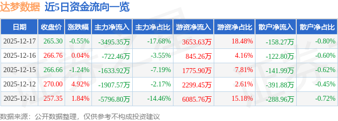 证券之星消息,截至2025年12月17日收盘,达梦数据(688692)报收于265.3元,下跌0.55%,换手率1.03%,成交量7497.0手,成交额1.98亿元。