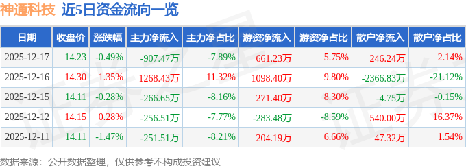 证券之星消息,截至2025年12月17日收盘,神通科技(605228)报收于14.23元,下跌0.49%,换手率1.88%,成交量8.05万手,成交额1.15亿元。