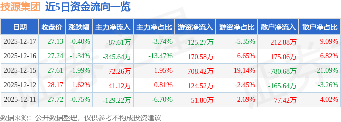 证券之星消息,截至2025年12月17日收盘,技源集团(603262)报收于27.13元,下跌0.4%,换手率2.24%,成交量8696.0手,成交额2341.76万元。