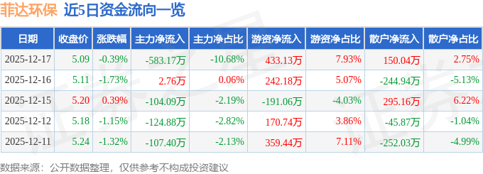 证券之星消息,截至2025年12月17日收盘,菲达环保(600526)报收于5.09元,下跌0.39%,换手率1.24%,成交量10.81万手,成交额5458.73万元。