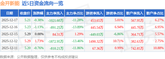 证券之星消息,截至2025年12月17日收盘,金开新能(600821)报收于5.21元,下跌0.38%,换手率0.87%,成交量17.42万手,成交额9054.14万元。