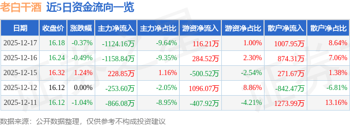 证券之星消息,截至2025年12月17日收盘,老白干酒(600559)报收于16.18元,下跌0.37%,换手率0.8%,成交量7.24万手,成交额1.17亿元。