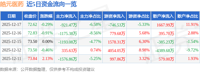 证券之星消息,截至2025年12月17日收盘,皓元医药(688131)报收于72.62元,下跌0.29%,换手率0.91%,成交量1.94万手,成交额1.4亿元。
