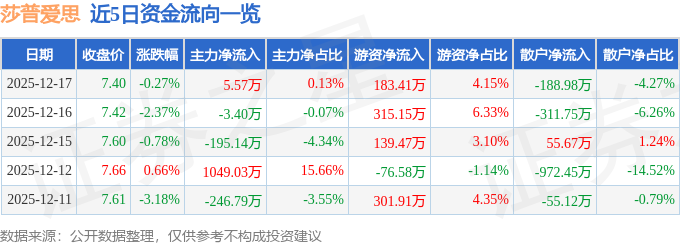 12月17日的资金流向数据方面,主力资金净流入5.57万元,占总成交额0.13%,游资资金净流入183.41万元,占总成交额4.15%,散户资金净流出188.98万元,占总成交额4.27%。