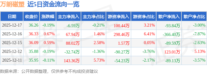 证券之星消息,截至2025年12月17日收盘,万朗磁塑(603150)报收于36.26元,下跌0.19%,换手率1.02%,成交量8694.0手,成交额3130.87万元。