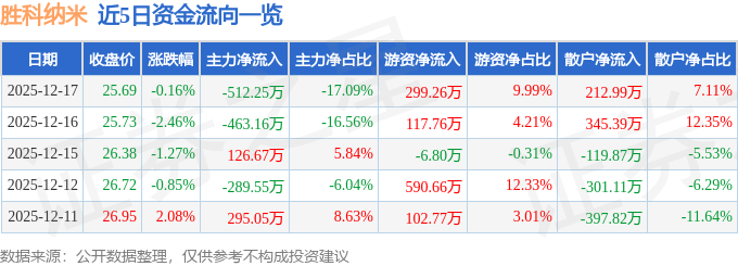 证券之星消息,截至2025年12月17日收盘,胜科纳米(688757)报收于25.69元,下跌0.16%,换手率3.36%,成交量1.18万手,成交额2996.58万元。