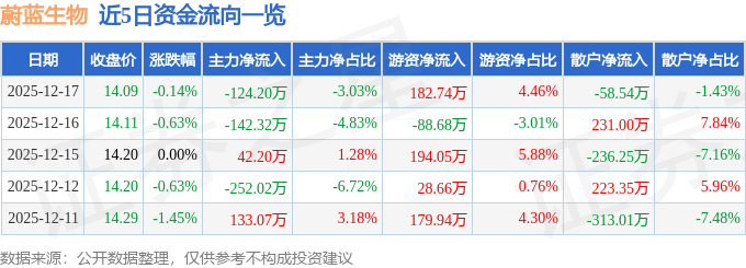 证券之星消息,截至2025年12月17日收盘,蔚蓝生物(603739)报收于14.09元,下跌0.14%,换手率1.16%,成交量2.92万手,成交额4098.75万元。