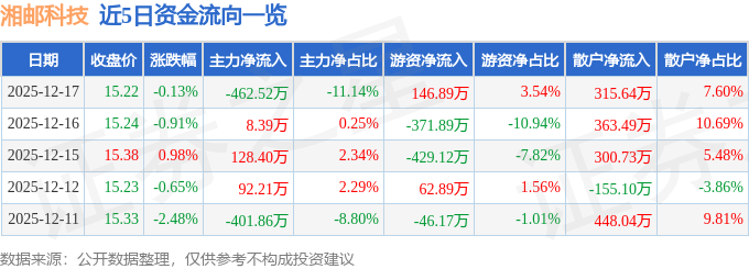 证券之星消息,截至2025年12月17日收盘,湘邮科技(600476)报收于15.22元,下跌0.13%,换手率1.71%,成交量2.76万手,成交额4151.47万元。