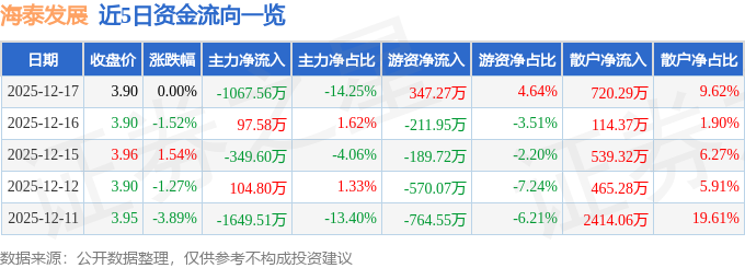 证券之星消息,截至2025年12月17日收盘,海泰发展(600082)报收于3.9元,上涨0.0%,换手率3.04%,成交量19.29万手,成交额7489.01万元。