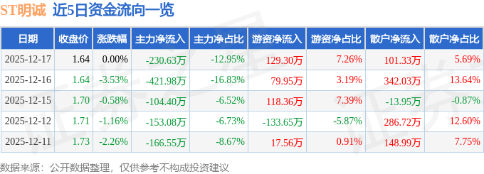 证券之星消息,截至2025年12月17日收盘,ST明诚(600136)报收于1.64元,上涨0.0%,换手率0.56%,成交量10.89万手,成交额1780.63万元。