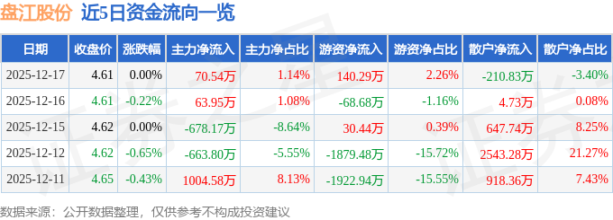 证券之星消息,截至2025年12月17日收盘,盘江股份(600395)报收于4.61元,上涨0.0%,换手率0.63%,成交量13.54万手,成交额6201.47万元。