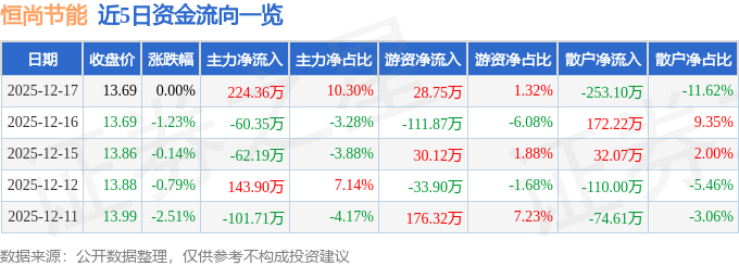 证券之星消息,截至2025年12月17日收盘,恒尚节能(603137)报收于13.69元,上涨0.0%,换手率2.18%,成交量1.6万手,成交额2178.33万元。