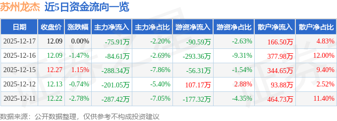证券之星消息,截至2025年12月17日收盘,苏州龙杰(603332)报收于12.09元,上涨0.0%,换手率1.33%,成交量2.88万手,成交额3448.16万元。