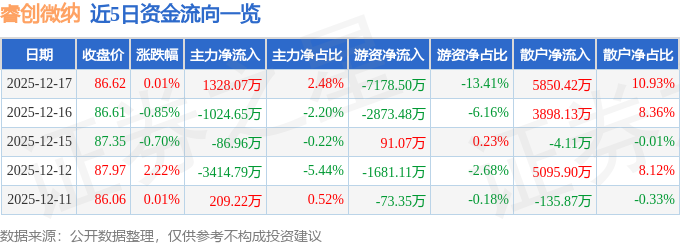 证券之星消息,截至2025年12月17日收盘,睿创微纳(688002)报收于86.62元,上涨0.01%,换手率1.36%,成交量6.24万手,成交额5.35亿元。