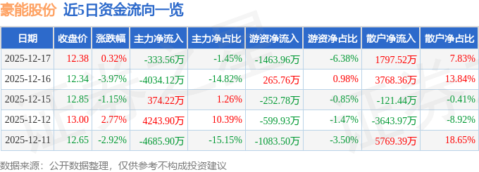 证券之星消息,截至2025年12月17日收盘,豪能股份(603809)报收于12.38元,上涨0.32%,换手率2.03%,成交量18.7万手,成交额2.29亿元。