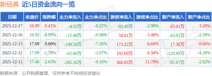 证券之星消息,截至2025年12月17日收盘,新经典(603096)报收于16.99元,上涨0.41%,换手率0.78%,成交量1.2万手,成交额2028.8万元。