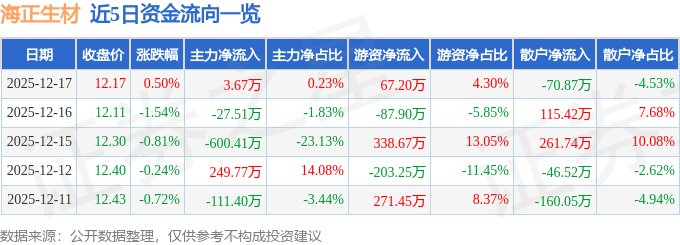 证券之星消息,截至2025年12月17日收盘,海正生材(688203)报收于12.17元,上涨0.5%,换手率1.05%,成交量1.3万手,成交额1562.77万元。