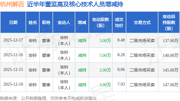杭州解百近半年内的董监高及核心技术人员增减持详情如下: