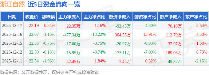 证券之星消息,截至2025年12月17日收盘,浙江自然(605080)报收于22.19元,上涨0.54%,换手率0.62%,成交量8751.0手,成交额1927.97万元。