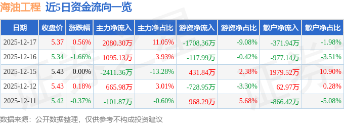 证券之星消息,截至2025年12月17日收盘,海油工程(600583)报收于5.37元,上涨0.56%,换手率0.8%,成交量35.32万手,成交额1.88亿元。