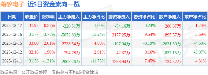 证券之星消息,截至2025年12月17日收盘,甬矽电子(688362)报收于31.95元,上涨0.57%,换手率1.75%,成交量7.19万手,成交额2.26亿元。