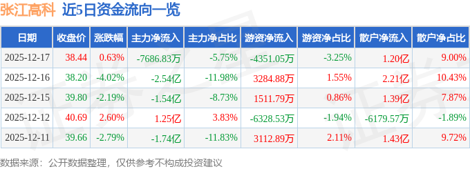 证券之星消息,截至2025年12月17日收盘,张江高科(600895)报收于38.44元,上涨0.63%,换手率2.27%,成交量35.19万手,成交额13.38亿元。