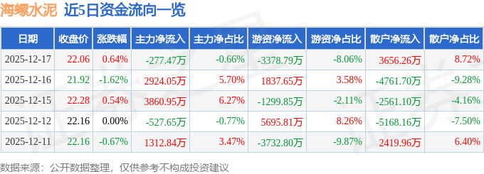 证券之星消息,截至2025年12月17日收盘,海螺水泥(600585)报收于22.06元,上涨0.64%,换手率0.48%,成交量19.1万手,成交额4.19亿元。