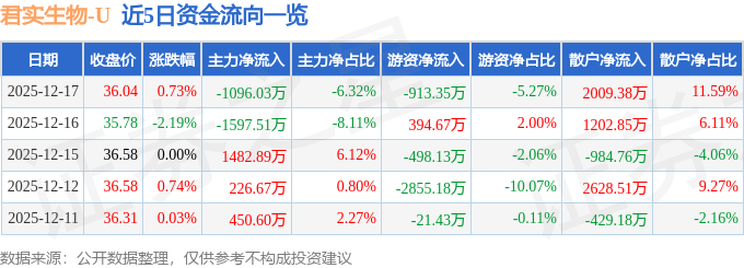 证券之星消息,截至2025年12月17日收盘,君实生物(688180)报收于36.04元,上涨0.73%,换手率0.63%,成交量4.85万手,成交额1.73亿元。
