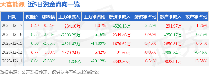 证券之星消息,截至2025年12月17日收盘,天富能源(600509)报收于8.4元,上涨0.84%,换手率2.03%,成交量27.93万手,成交额2.32亿元。
