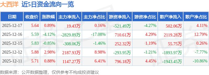 证券之星消息,截至2025年12月17日收盘,大西洋(600558)报收于5.64元,上涨0.89%,换手率2.43%,成交量21.82万手,成交额1.22亿元。