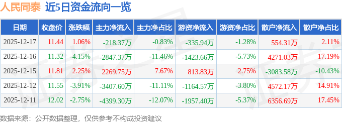 证券之星消息,截至2025年12月17日收盘,人民同泰(600829)报收于11.44元,上涨1.06%,换手率3.96%,成交量22.96万手,成交额2.63亿元。