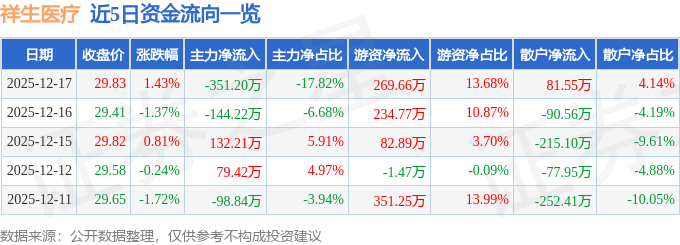 证券之星消息,截至2025年12月17日收盘,祥生医疗(688358)报收于29.83元,上涨1.43%,换手率0.6%,成交量6691.0手,成交额1970.7万元。
