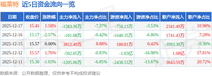 证券之星消息,截至2025年12月17日收盘,福莱特(601865)报收于15.41元,上涨1.58%,换手率0.74%,成交量14.09万手,成交额2.15亿元。
