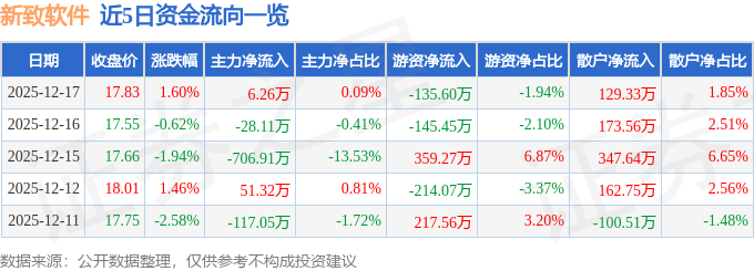 证券之星消息,截至2025年12月17日收盘,新致软件(688590)报收于17.83元,上涨1.6%,换手率1.51%,成交量3.97万手,成交额6986.38万元。