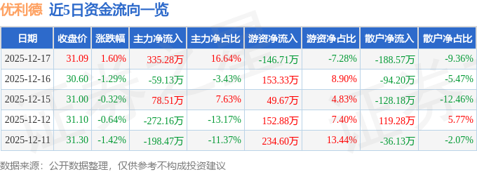 12月17日的资金流向数据方面,主力资金净流入335.28万元,占总成交额16.64%,游资资金净流出146.71万元,占总成交额7.28%,散户资金净流出188.57万元,占总成交额9.36%。