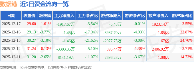 证券之星消息,截至2025年12月17日收盘,数据港(603881)报收于29.6元,上涨1.61%,换手率2.57%,成交量18.46万手,成交额5.42亿元。