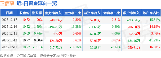 证券之星消息,截至2025年12月17日收盘,卫信康(603676)报收于10.72元,上涨1.9%,换手率0.41%,成交量1.77万手,成交额1880.96万元。